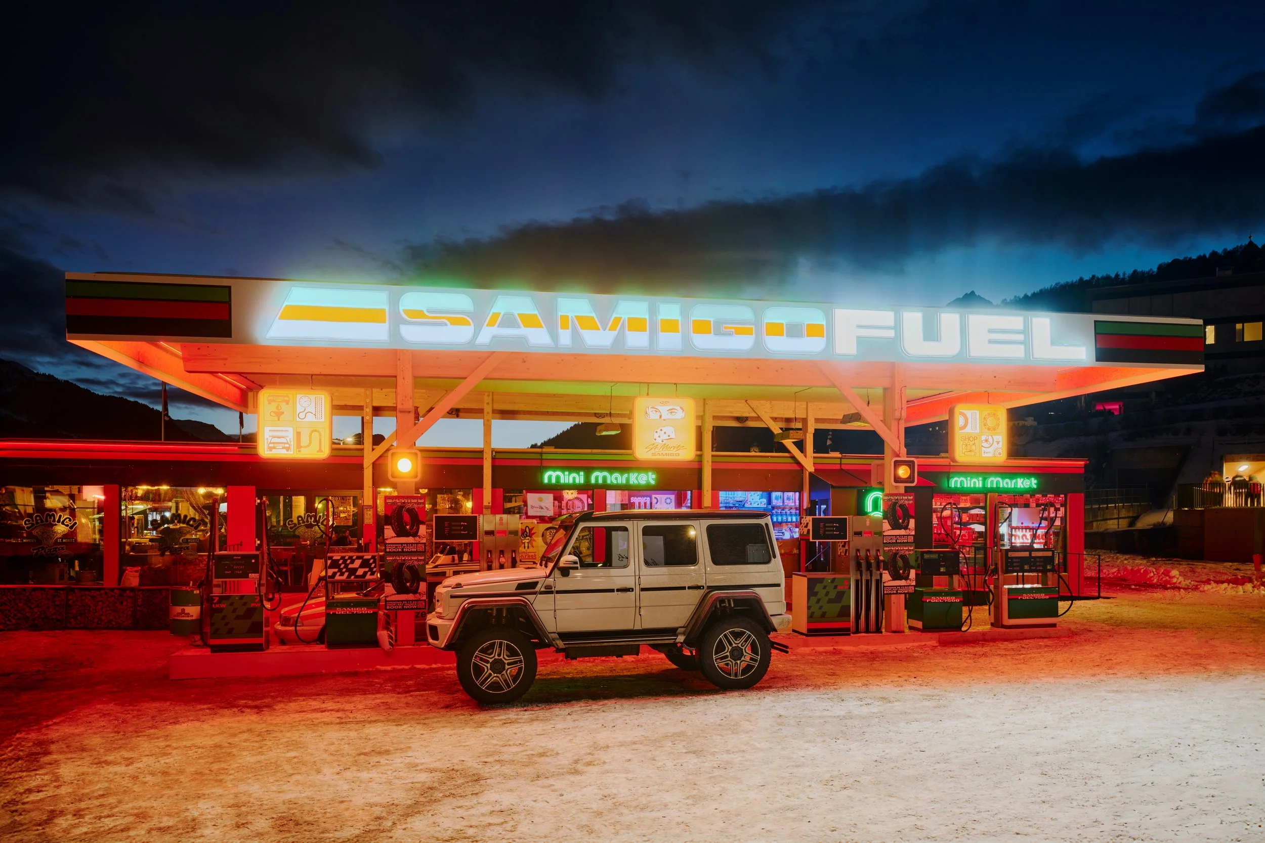 A conceptual “fake” gas station that revealed much more than it seemed: inside, a charming restaurant, a vibrant nightclub, and a kiosk, each designed to create an unforgettable experience full of surprises in the heart of